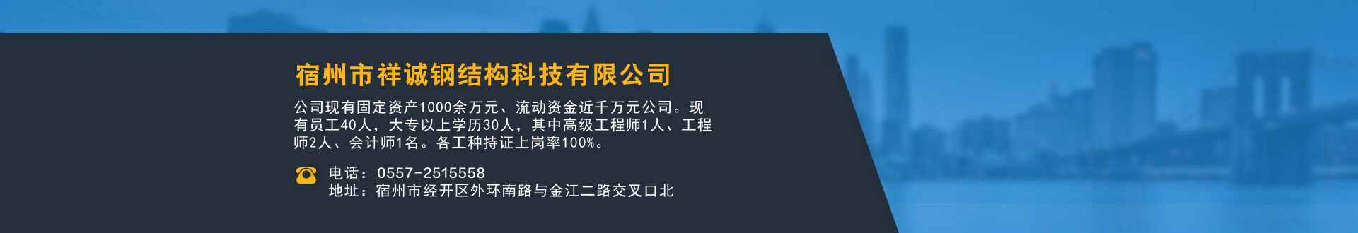 宿州市祥誠鋼結構科技有限公司位于宿州市經開區外環南路與金江二路交叉口北,公司是一家以建設產業化為目標,匯集大型鋼結構廠房、彩鋼活動房設計、制作、安裝施工一條龍服務的知名鋼結構公司。公司現有固定資產1000余萬元、流動資金近千萬元公司。現有員工40人,大專以上學歷30人,其中高級工程師1人、工程師2人、會計師1名。各工種持證上崗率100%。高效化的年青團隊為公司帶來了蓬勃發展的動力,全體員工以務實的態度,拼搏的精神,創造著企業的每一天。      公司組織結構嚴格按現代企業制度設計,管理機構設置合理,制度完善,各部門分工明確...